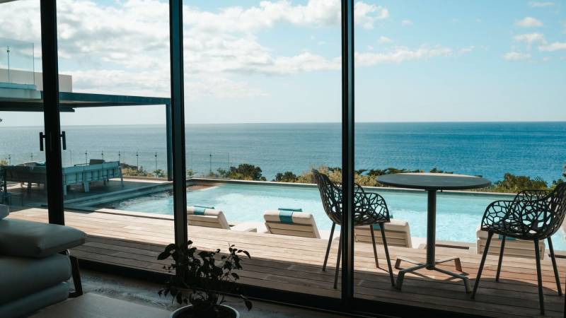 La pièce à vivre, un open space majestueux, est inondée de lumière naturelle grâce à de grandes baies vitrées. Cet espace s'ouvre directement sur une terrasse panoramique où se trouve une magnifique piscine, véritable invitation à la détente face à l'horizon marin.