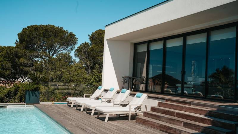 Dès votre arrivée, vous serez séduit par l’architecture moderne et raffinée de la villa, harmonieusement intégrée dans le paysage environnant. Chaque étage de la maison a été conçu pour maximiser la vue spectaculaire sur la mer Méditerranée, transformant chaque pièce en un tableau vivant.
